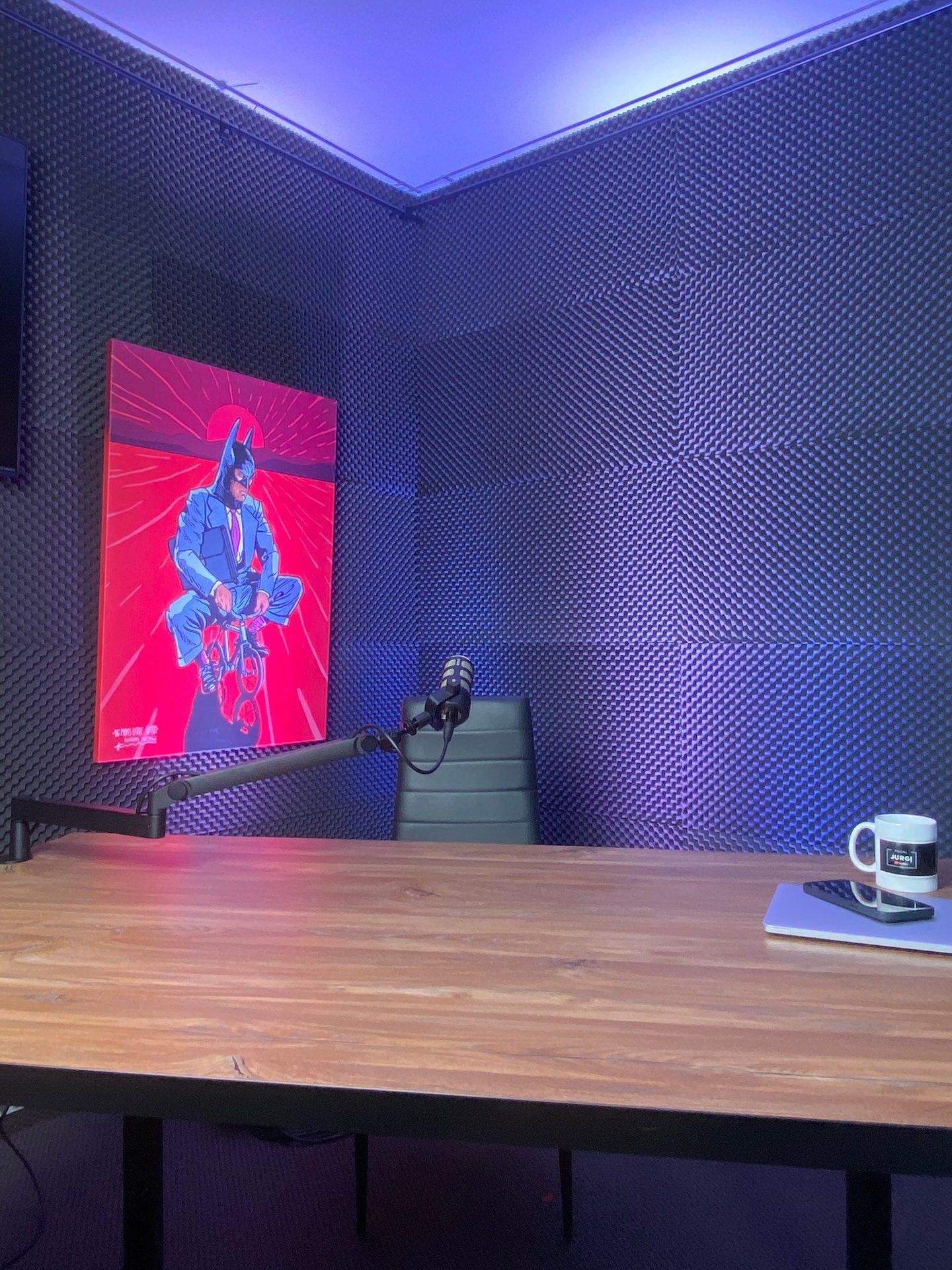We have the opportunity to film your podcasts for 2-3 people, two chairs, a sofa together with professional microphones, professional cameras and perfect lighting for every taste are ready for this. We can change the color of the curtains (dark and light), reveal or cover the TV screen as needed, change the colors and brightness of the lighting. You can bring your desired props to the studio, which we will place or hang during the filming. This will create uniqueness and distinction among other podcasts.