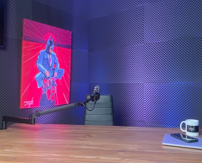 We have the possibility to film your podcasts for 3-4 people, a brown or white table and chairs are prepared for this, together with professional microphones, professional cameras and perfect lighting. We can change the image behind depending on the need between light and dark curtains. It is recommended that you bring your own paraphernalia to make the podcast unique.
